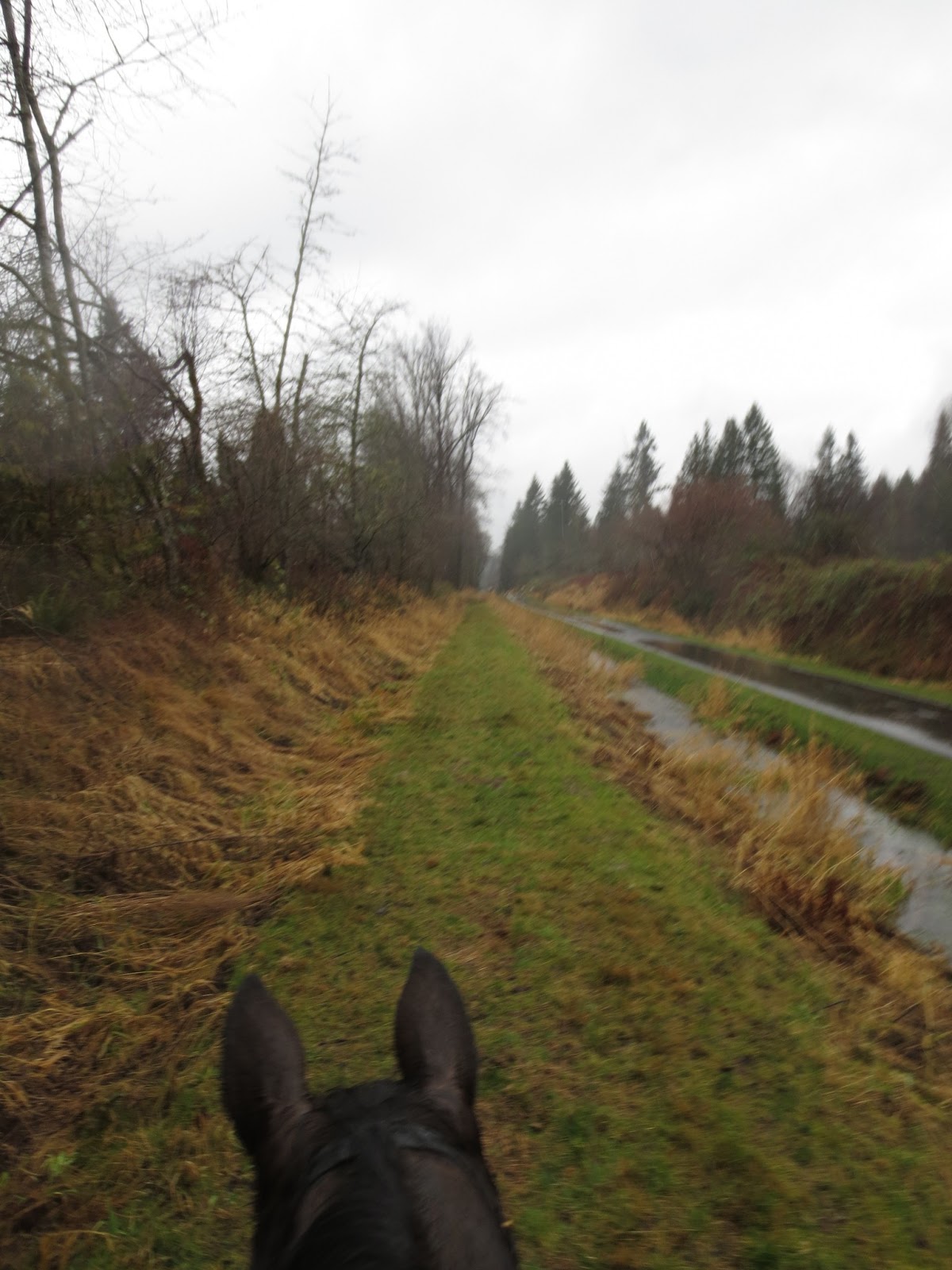 This trail, if not amended and armored promptly by a LOT of gravel, is going to end up hock-deep in shoe-sucking mud. And once it gets chopped up by horse feet it will never drain and will require an excavator to clear out so that gravel can be added. Yowch.