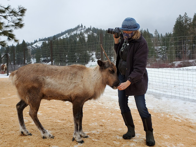 | Reindeer don't care about facemasks. This one thought that Jim's camera looked like the little plastic container of food that visitors bring. |